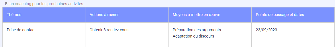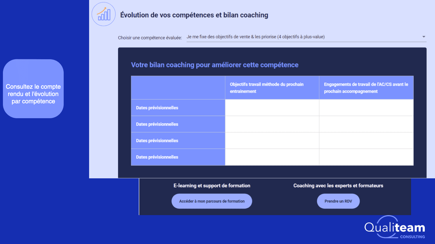Nous vous proposons de suivre vos collaborateurs dans leur montée en compétence en leur mettant à disposition des comptes rendus d’accompagnements (objectifs, thèmes à travailler, actions à mettre en place et des dates de futurs coaching).