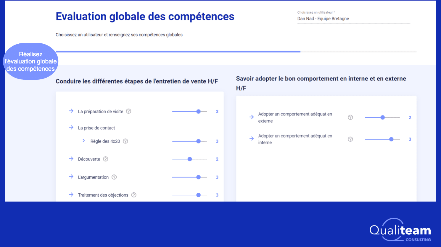 Grâce à Qualiteam en un clic, je visualise les évolutions des équipes, leurs axes de progrès ainsi il est plus facile pour moi de les faire monter en puissance.